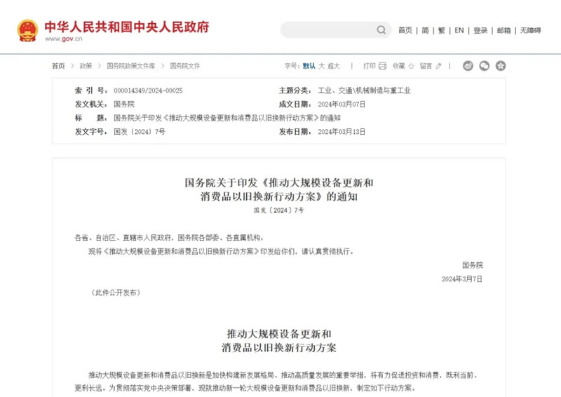 《推動大規模設備更新和消費品以舊換新行動方案》的通知